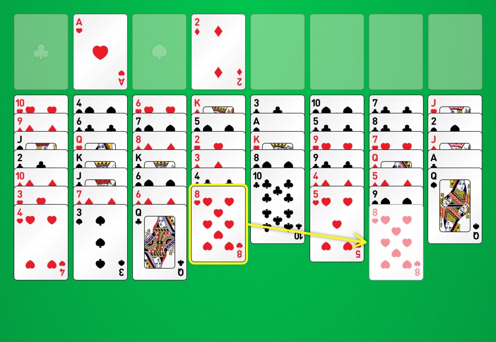 The games start with eight columns of cards, all 52 of them, where the first four columns have seven cards, while the other four have six.